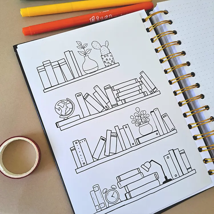 يا عشاق القراية والـ بوليت جورنال اللي بيحبوا يسجّلوا كل كتاب قرأوه، متتبع الكتب (Book Tracker) من Egy Bujo هو الإضافة اللي هتخلّي tracking قائمة الكتب متعة فنية! الشيت ده مقاس 14 × 20 سم، يناسب الدفاتر والـ planners بكل الأحجام، وفيه 4 تصاميم رفوف كتب خطوط فنية بسيطة: رف بكتب وصبار، رف مع كرة أرضية وكتب، رف بزهرة وكتب، ورف بمصباح وكتب وساعة — كلها جاهزة للتلوين والكتابة.